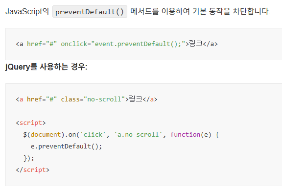 💡 HTML 링크 클릭 시 페이지가 위로 올라가는 현상 막는 방법웹페이지에서 형태의 링크를 클릭하면 브라우저는 기본적으로 페이지 최상단으로 스크롤 이동합니다.이 동작을 막고 싶다면 아래와 같은 방법으로 제어할 수 있습니다.✅ 방법 1: event.preventDefault() 사용JavaScript의 preventDefault() 메서드를 이용하여 기본 동작을 차단합니다.링크jQuery를 사용하는 경우:링크✅ 방법 2: href="javascript:void(0)" 사용# 대신 JavaScript 빈 함수 호출을 사용하면 페이지 이동이 발생하지 않습니다.링크주의: 일부 웹 접근성이나 보안 가이드에서는 javascript: 사용을 권장하지 않습니다.✅ 방법 3: href="!" 등의 가짜 링크 사용브..