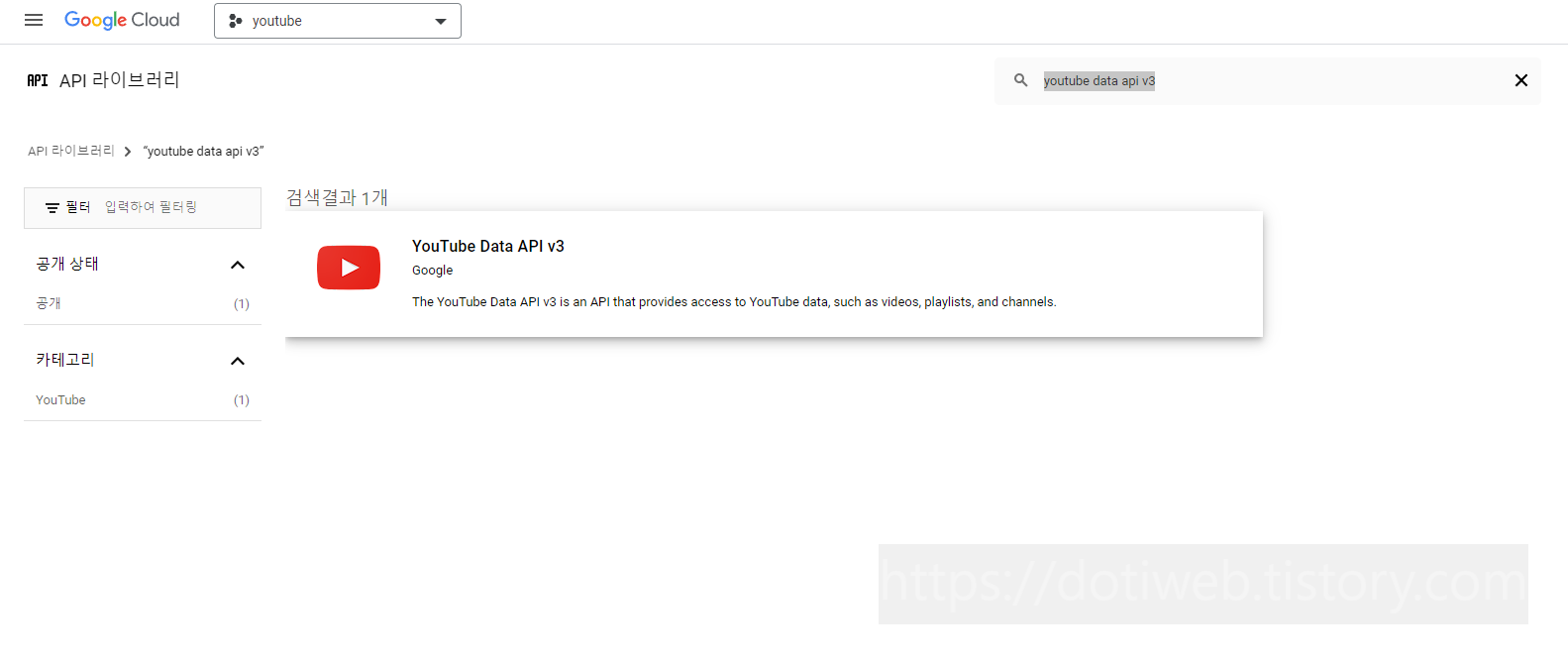 8. 검색된 라이브러리 YouTube Data API v3 를 선택한다.