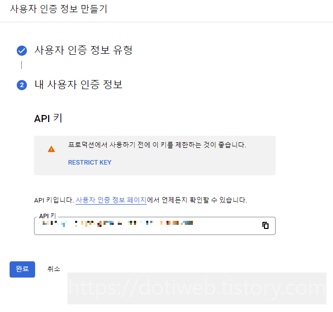 12. API키가 발급되면 해당 API키를 복사한 후 완료 버튼을 선택한다.