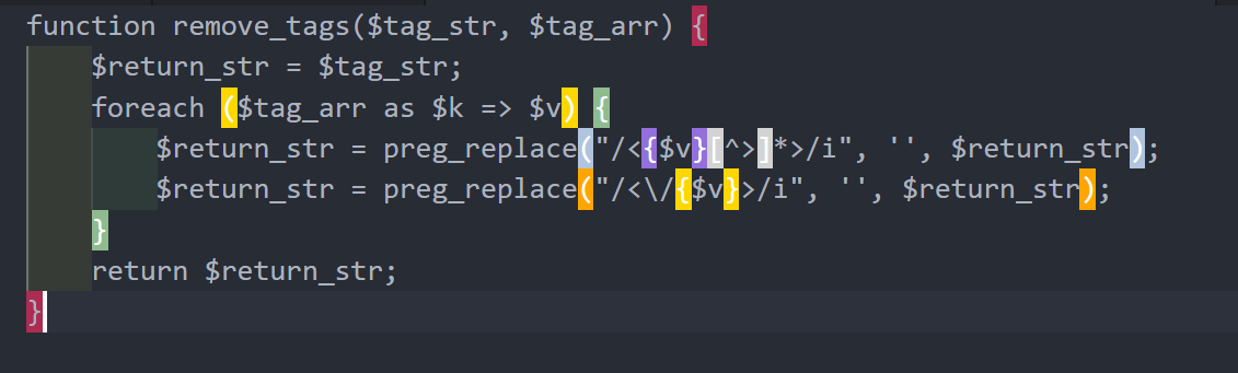 [PHP] 특정 태그 제거 함수 본문 내 특정 태그만 제거 후 출력할때 유용하게 쓰인다 remove_tags() 함수 정의 function remove_tags($tag_str, $tag_arr) { $return_str = $tag_str; foreach ($tag_arr as $k => $v) { $return_str = preg_replace("/]*>/i", '', $return_str); $return_str = preg_replace("//i", '', $return_str); } return $return_str; } 내용 중 br, p 태그만 제거 remove_tags($content, array("br","p"));
