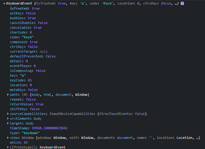 키보드 이벤트 타입 키보드 이벤트는 사용자가 키를 누르거나 키를 높을 때 발생한다. 키를 누를 때는 keydown, 키를 놓을때는 keyup 이벤트가 발생된다. 예전에는 keypress 이벤트도 많이 사용되었으나, 현재는 사용을 권장하지 않는다. 키보드 이벤트는 DOM 상의 창(windows)이나 문서(document), 또는 요소(element)에서 발생된다. 예를 들어 창(window)에서 발생하는 keydown 이벤트 처리는 다음과 같이 콜백(callback) 함수를 설정해주면 된다 window.onkeydown = (e) => console.log(e); addEventListener 함수를 이용해도 된다. window.addEventListener("keydown", (e) => console...